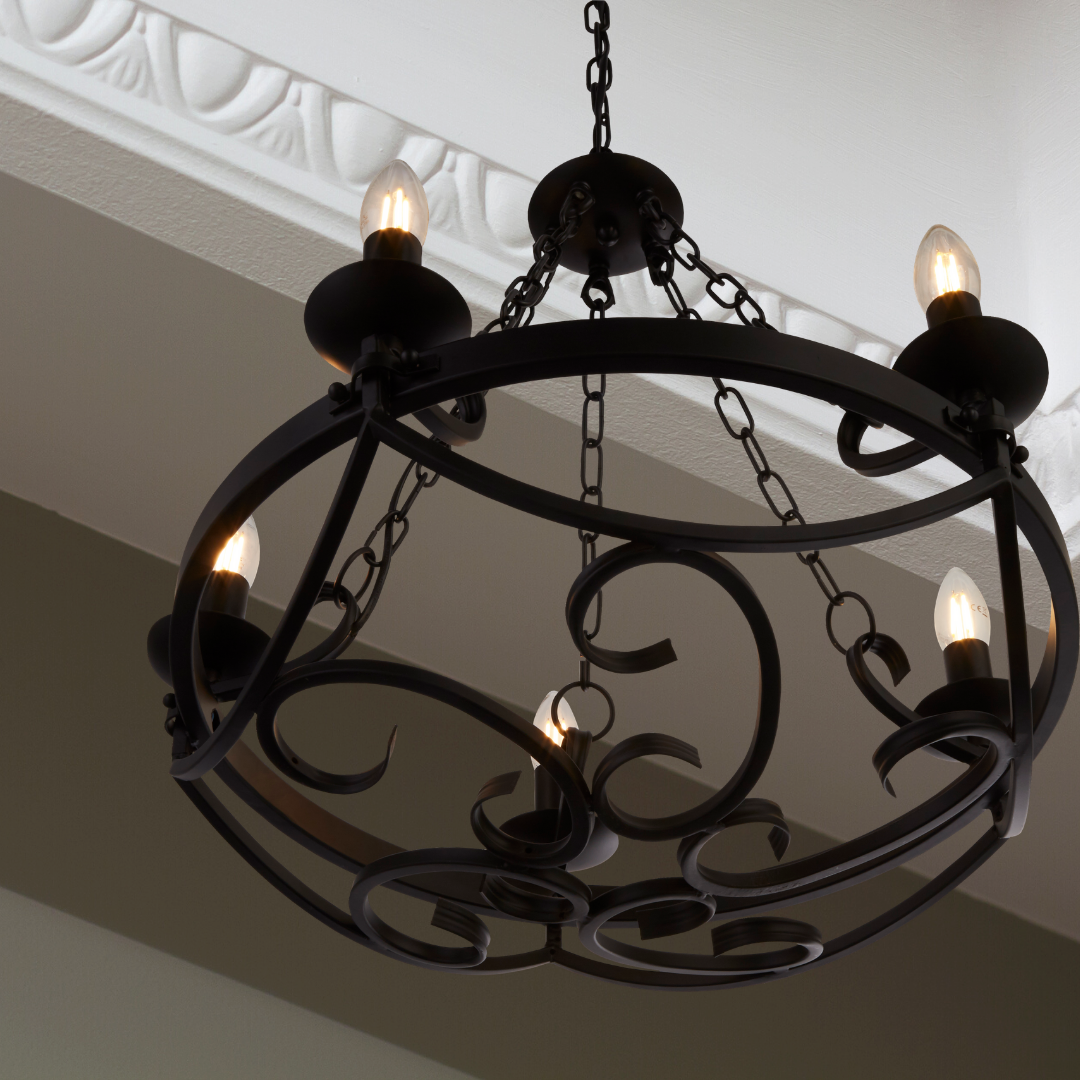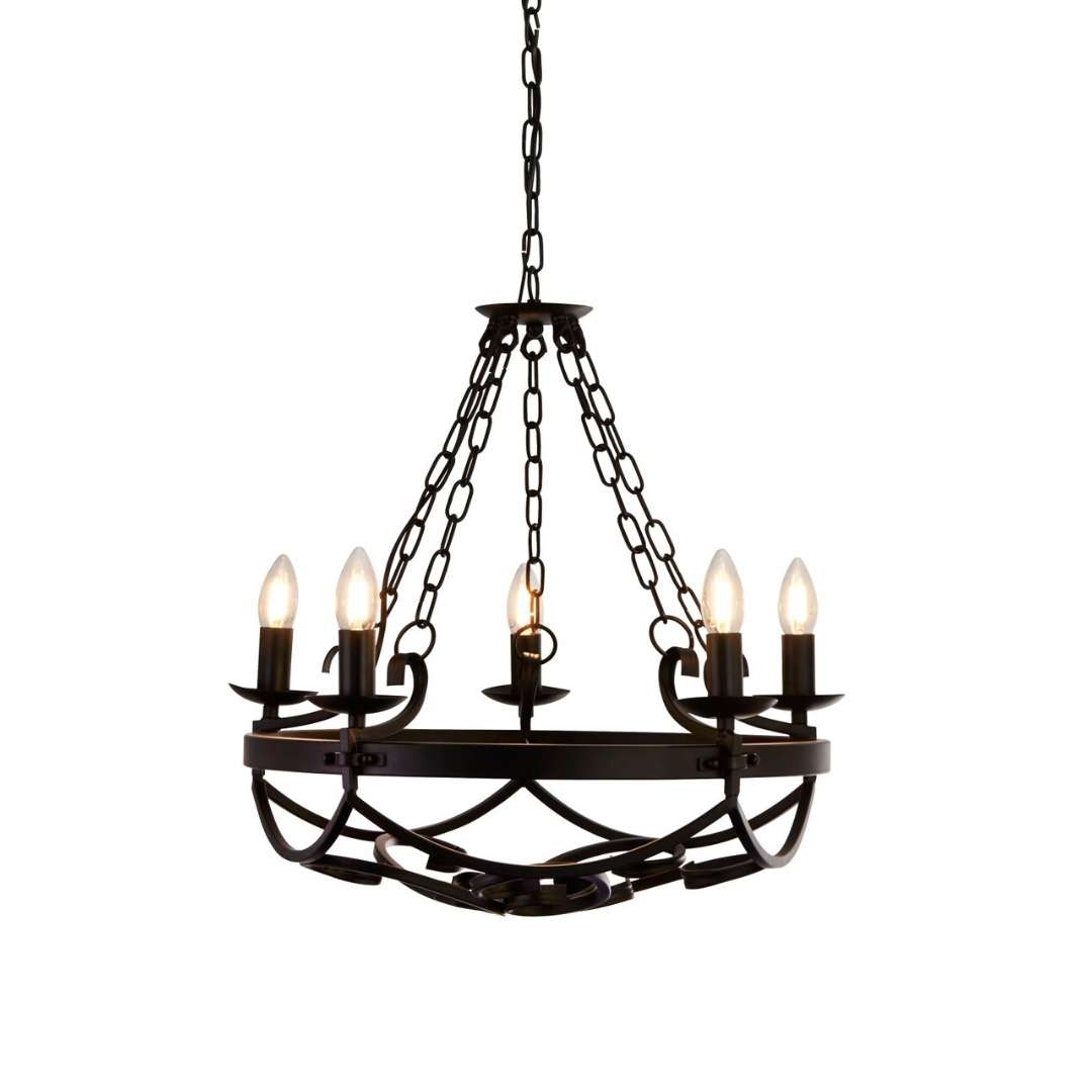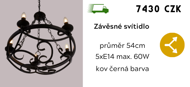 Závěsné svítidlo kov černá barva. Průměr 54cm, od stropu 102cm. Patice pro světelné zdroje jsou E14 na max. 5x40W. Žárovky nejsou v balení jako součást. lustr patří do kolekce Cartwheel od výrobce svítidel Searchlight.